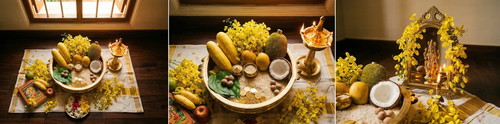Welcome the Kerala New Year with auspicious kani flowers and traditional gifts.